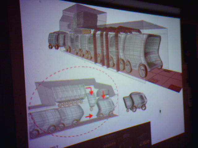 ![]() ![]() ![]() Peter Schmitt of the Smart Cities project is giving us a show of a series of wildly innovative car designs. For example, a small car that nests together with others of its kind the way shopping carts do (3). The Smart Car project is a collaboration between GM, Frank O. Gehry and MIT. - mike lee - cambridge, ma |