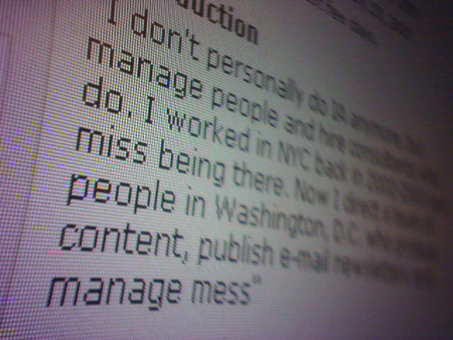![]() ![]() ![]() While typing in a short blurb about myself into a Meetup.com profile form earlier this week, I realized there was a 250 character text field limit that clipped my last sentance to a funny result. I originally typed this: Now I direct a team of people in Washington, D.C. who produce content, publish e-mail newsletters and manage message boards for AARP.org. Which became this (emphasis added): Now I direct a team of people in Washington, D.C. who produce content, publish e-mail newsletters and manage mess I laughed out loud at my desk and rewrote: Now I direct a team of people in Washington, D.C. who produce content for AARP.org. - mike lee - washington, dc |