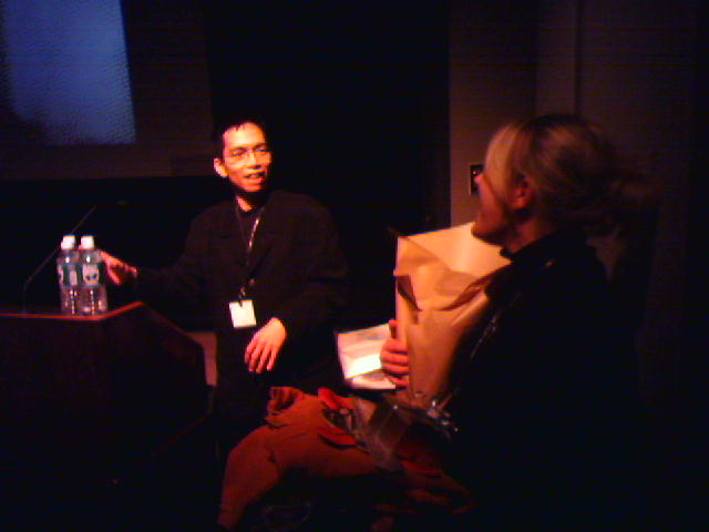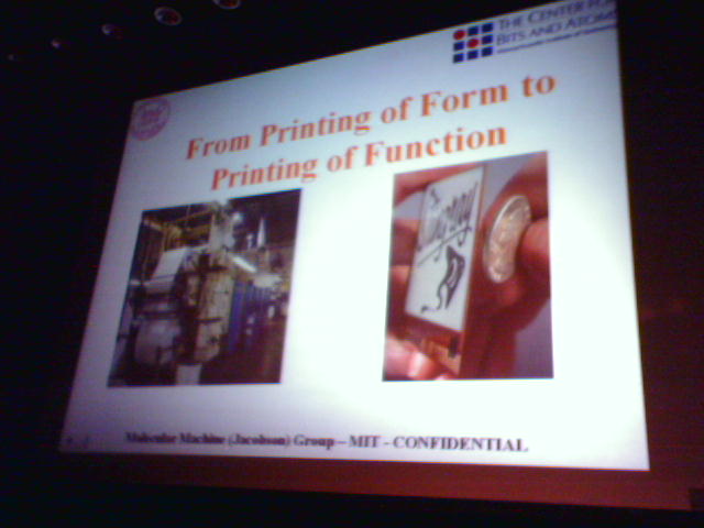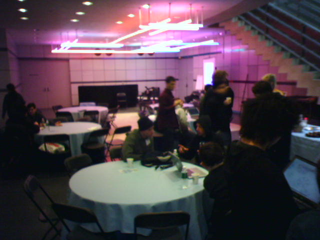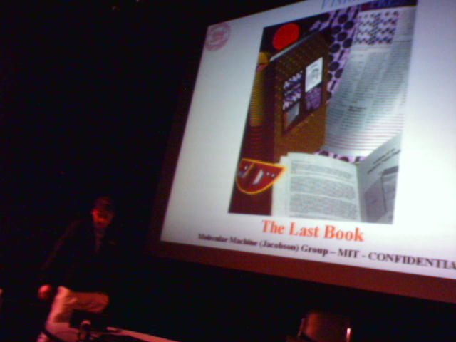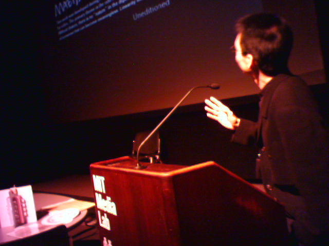 ![]() ![]() ![]() ![]() ![]() ![]() ![]() ![]() ![]() ![]() ![]() Luckily I remembered that I had a USB charging cable (1) for my Sidekick, so I used a Media Lab paper clip to do a hard reset of my crashed phone, and am giving it a full charge from my laptop while we are on break from the event. The Snowflake-a-thon is underway. Students are showing their snowflake creations in the lower atrium and two people are videotaping the results for the awards ceremony at 4pm. An iPod mini will be given away as a first prize. After the whirlwind (typical) lab tour to get updates from some of the students, we all took to our assigned seating in the atrium for lunch. I had nice conversation with Deb Roy about how we need to dispel the average person's notion of robots as humanoid machines. Deb says with the arrival of consumer products such as the Roomba vacuum, we can think of robots as just very helpful tools. The hour's worth of talks started at 1pm in the Bartos Auditorium. John kicked off the session by showing a 3-minute video of abstract, snowflake-like computer aninimations (2, 3). Then a bunch of us presented gifts to John's assistant Heather (4) who is leaving soon to go on maternity leave. I went up first with a short presentation on some 3D paper web site maps I experimented with a couple years ago (5, 6, 7). Then Peter Meirs of Time Interactive showed a very enlightening (and funny) video of some of his co-workers talking about Time, Inc's massive operation around the use of paper for it's vast array of print magazines (8, 9). Last up was Joe Jacobson of the Center for Bits and Atoms to give an update on the latest developments at E-ink, where is is a founding scientist (10, 11). He talked about the new Sony manga e-book, and showed some unreleased video of full motion video running on a greytscale E-ink display. He also mentioned that the second generation of color E-ink displays is coming later this year, and will be impressive to see. Now we're checking the weather reports on snow and inauguration-related flight delays. Let's hope not. - mike lee - cambridge, ma |