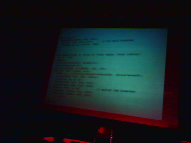 ![]() ![]() ![]() ![]() ![]() ![]() ![]() ![]() From 2 - 4pm, 19 students from all over MIT presented their digital snowflakes to one of two videographers in the atrium (1, 2, 3). There were several really cool projects. One I captured on the Sidekick was Ben Dalton's kaleidoscopic snowflake. Coded in Processing graphics programming language, Ben's snowflake takes a video feed from an Apple iSight camera and pipes it into each of six rotated facets. The photos here (4, 5) show a PowerBook's lighted power plug rendered as a snowflake. At 4pm, a roughcut video of each of the participants' presentations was shown (6, 7) including peeks at the sourcecode to show efficiency. Contestants worked with a variety of development tools and languages including Processing, OpenGL, Java, Python and C++. The first prize of an iPod mini went to Hugo Liu for his snowflake which, in 86 lines of Python, mined Googlism for comments on a given famous person, processed the text fragments through linguistic heuristics (rules), and composed an ode to the individual in the first person as text wrapped around a snowflake. Hopefully some of the entries will get posted to the web somewhere. One our way out of the lab it was snowing (8)--what an approriate end to the Snowflake-a-thon. - mike lee - boston logan airport |