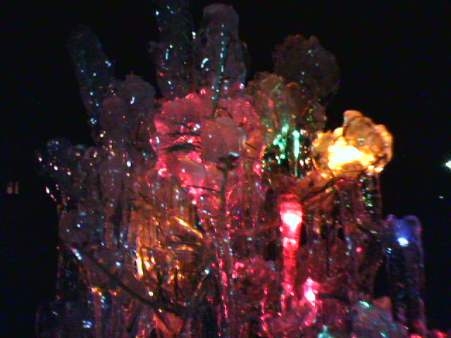 ![]() ![]() ![]() ![]() ![]() On our way home to Baltimore tonight, we stopped in Halethorpe, a little town south of Baltimore, to admire our friend Bill's ice-covered Xmas tree. No, we haven't had an ice storm here lately; Bill rigged a garden hose over their tree in the backyard, and sprayed water on it non-stop for two days. A string of lights remained embedded inside. The icy coating grew to form beautiful knobs and stalagtites of crystal, which, in darkness, conducted the colored light in wonderful ways. - mike lee - |