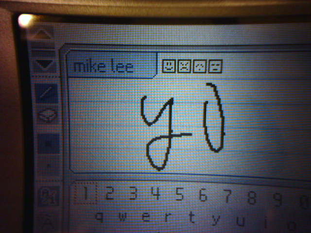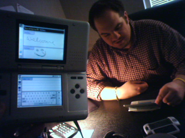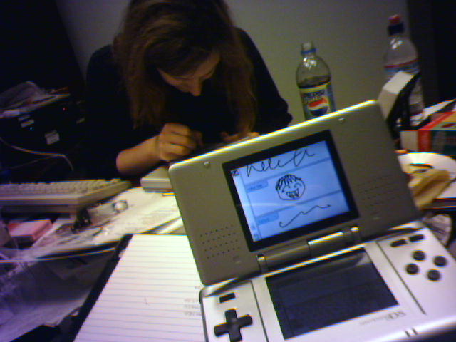 ![]() ![]() ![]() ![]() I found out a couple days ago that Ashley (1) and Kathy (4) at work both got Nintendo DSs, so I brought mine in today test out the wireless multi-player features for the first time. We tried out the built-in picture chat utility PictoChat (2 & 3) and the head-to-head VS mode of Super Mario Brothers. Inside the office, the wireless range seems to be about 15 feet through walls, so the chat won't be useful since the three of us are on separate floors and buildings. But the VS game mode looks very fun. We're going to meet up again soon for some lunchtime gold star chasing. - mike lee - washington, dc |
