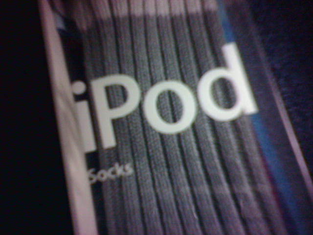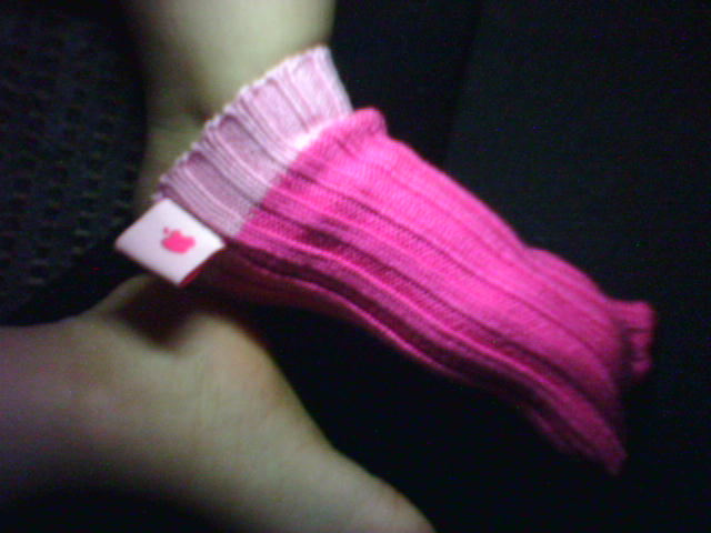 ![]() ![]() ![]() ...an iPod Sock on a 13-month-old's foot. It barely works as an ankle sock, not to mention that it cost $4.99. Cianna yanked it off right after I got the photo, but she does that anytime she has socks on. My shopping companions have already claimed a couple of the colors for their 'pods. Another will go on my mini, and over a small digital camera. We'll see how well they hold up to wear. - mike lee - |