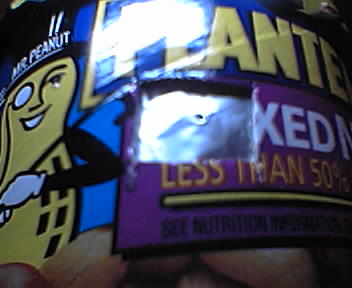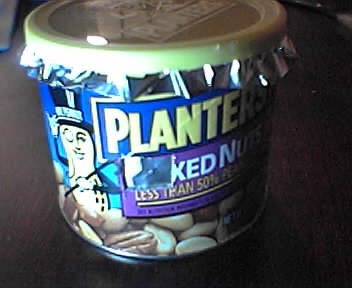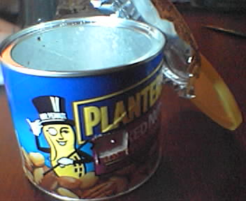 ![]() ![]() ![]() This is a panoramic pinhole camera made from an 11.5oz. can of Planters Mixed Nuts. The camera has a foil aperture plate in stalled in a sqaure hole next to the Mr. Peanut. graphic. The lid has an extra disc of foil under it to protect the film inside from light leaks. In practice, the aperture is covered with black masking tape. In total darkness, a piece of 120 film or trimmed 4x5 sheet film is taped to the back wall of the inside of the can opposite of the aperture. With everything sealed up, you take the can out into the world, place it somewhere and lift the tape for some amount of time to make an exposure. How long you expose is the art and science of pinhole photography. |