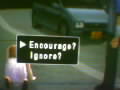 Just picked up the PS2 game Disaster Report and came across this choice. I think it perfectly captures the male question. It shows a male character (you) standing near a distressed female character, and the option reads "Encourage? or Ignore?" Joe / mobile aim: dredmobile / mobile.fourhman.com |